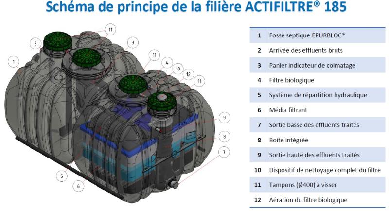 L’Actifiltre® 185 est un dispositif de traitement des eaux usées domestiques ou assimilées. Il comprend une fosse septique toutes eaux qui alimente un filtre biologique composé de fibres synthétiques inaltérables. Ce substrat innovant possède des propriétés filtrantes largement supérieures à la majorité des autres substrats utilisés traditionnellement.
