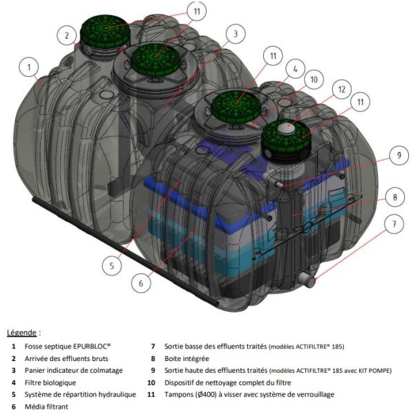 Les modèles de fosses septiques de la gamme EPURBLOC® 185 sont fabriqués en polyéthylène haute densité (PEHD), équipés d’accès sécurisés et obligatoirement munis d’un panier indicateur de colmatage développé par RIKUTEC France. Le temps de séjour minimal des effluents dans la fosse septique est de 3 jours. La capacité de stockage des boues est fixée à 50 % du volume total utile de la fosse septique. Les boues des fosses septiques sont évacuées conformément à la réglementation en vigueur (Arrêté du 7 septembre 2009 modifié, relatif aux modalités d’agrément des personnes réalisant les vidanges).