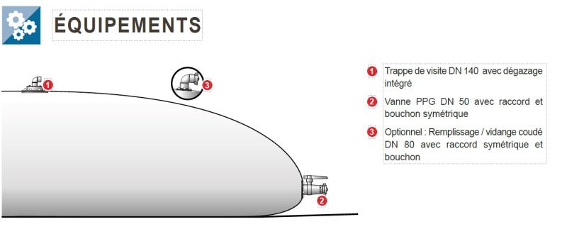 Sur le côté : Piquage remplissage/vidange DN 50 avec vanne PPG, raccord pompier et bouchon symétrique