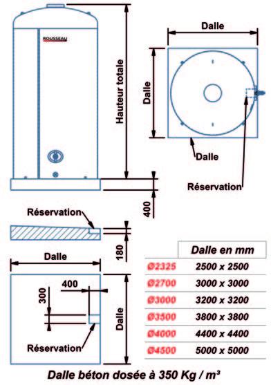 • Une dalle armée d’au moins 30 à 40 cm d’épaisseur, dimensionnée en fonction du diamètre de la cuve (+ débord de toiture éventuel).