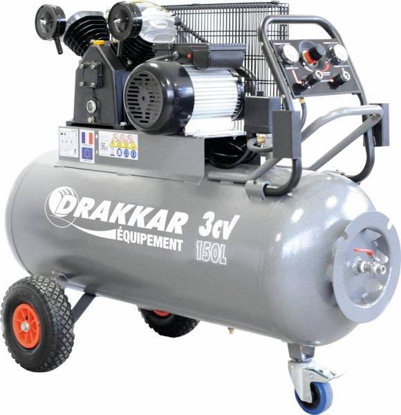 Compresseur Drakkar 150L 9bar 3CV à courroie pour atelier, garage ou chantier. Solution fiable avec 150L, 9bar, 22.80m3/h.